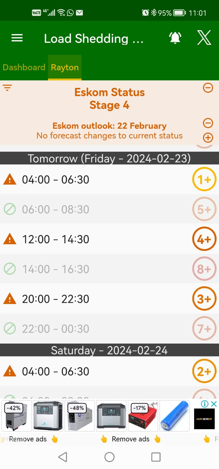 Foto van beurtkrag skedules soos verkry op “Loadshedding Notifier”, ‘n slimfoon toepassing wat gebruik word.