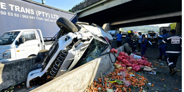 DURBAN, NATAL. – Een persoon is dood en nog een beseer toe ’n voertuig wat groente vervoer het oor die N2-brug noord van Durban getuimel het.