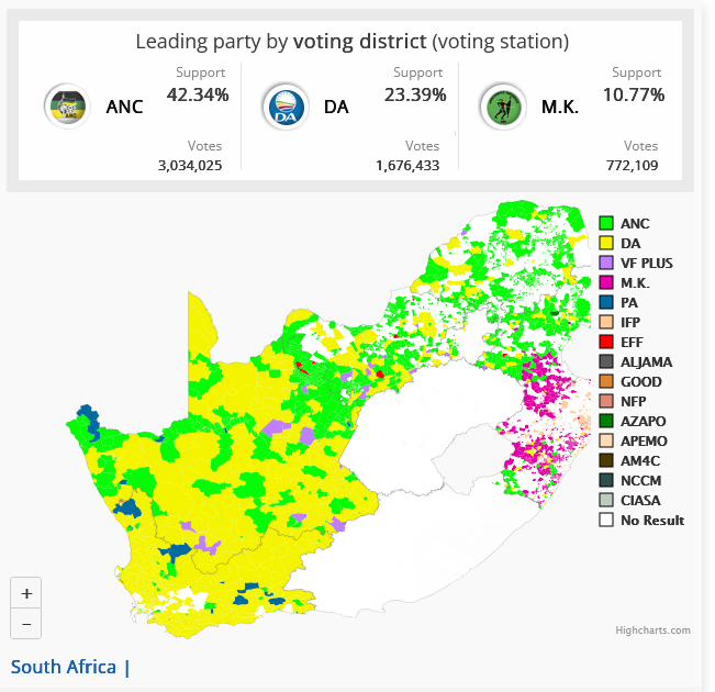 So het nie veel verander nie buiten Zuma se opkoms in Natal. Nou wag ons vir die koalisies wat gevorm gaan word waar mag en geld tel en nie beginsels nie.