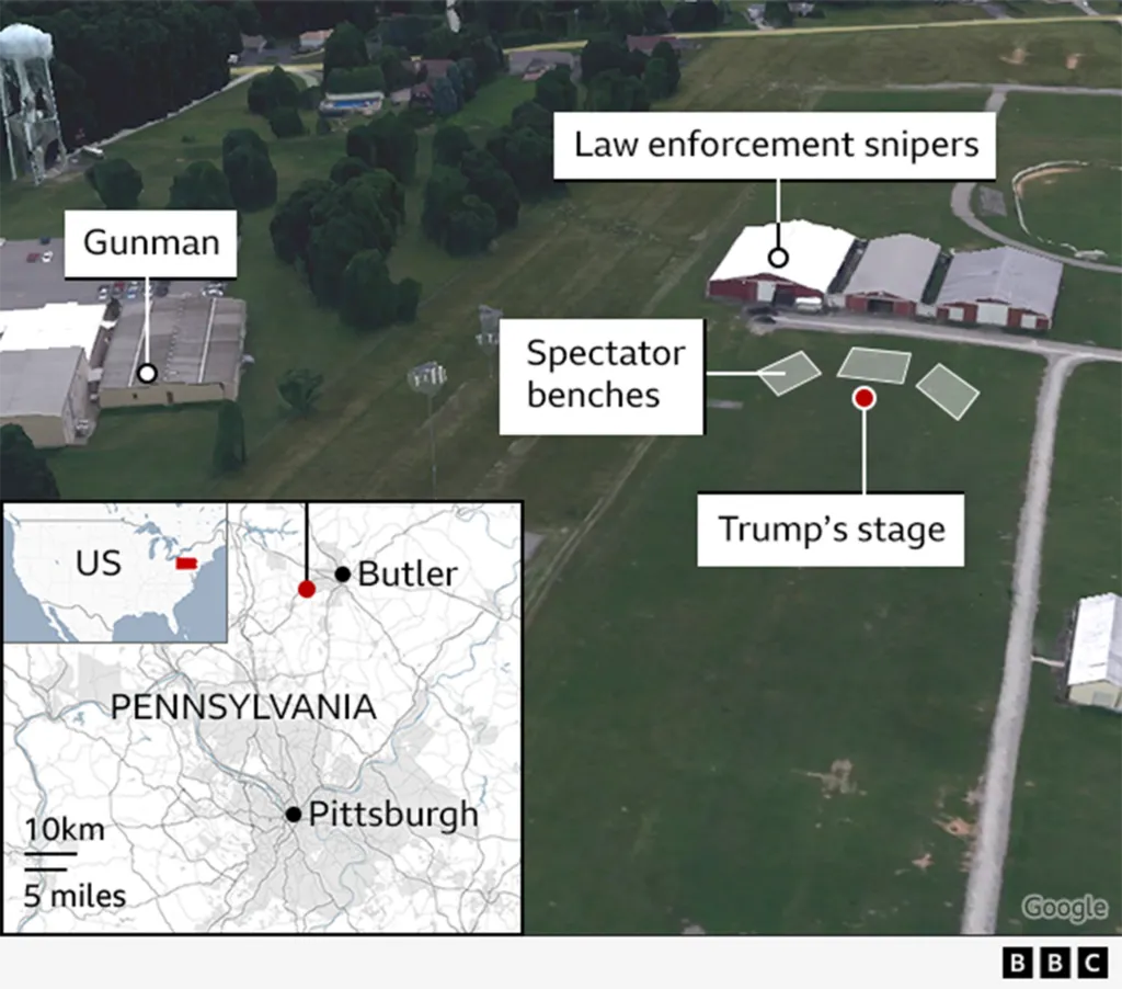 Een getuie het aan die BBC gesê hy het ‘n man – glo Crooks – met ‘n geweer op die dak van ‘n gebou gesien voordat daar op Trump geskiet is.
