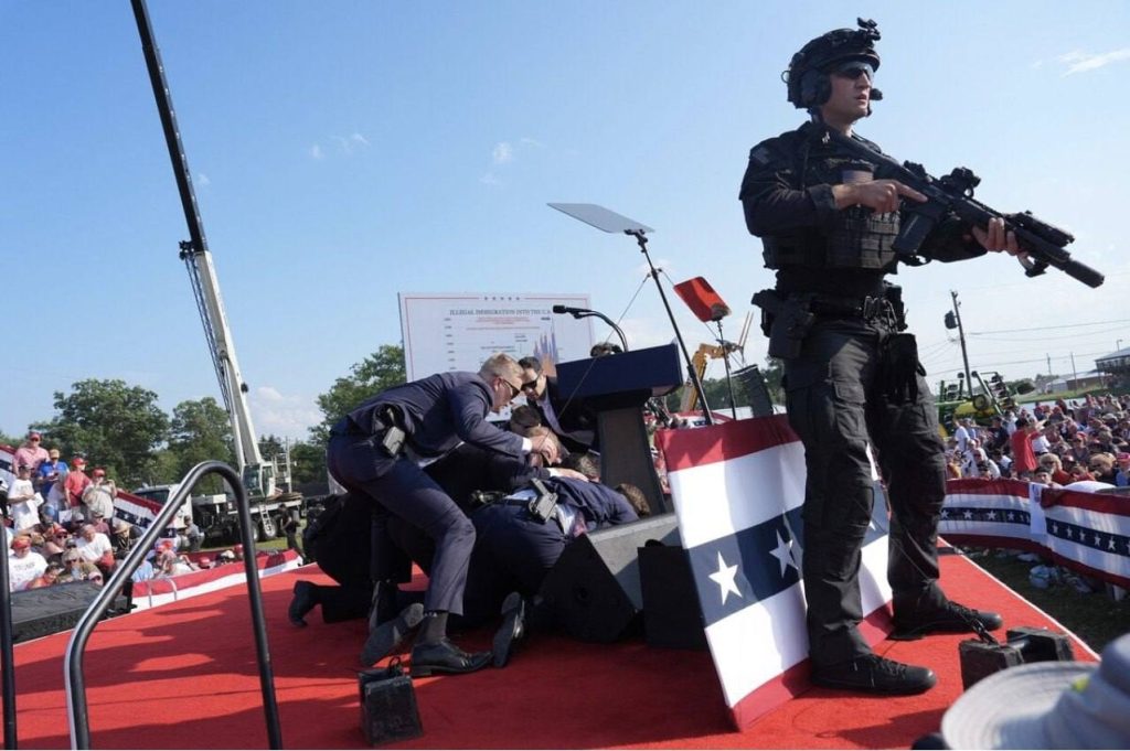 Bloed was op Trump se oor en gesig sigbaar toe beskermingsbeamptes hom weggejaag het.