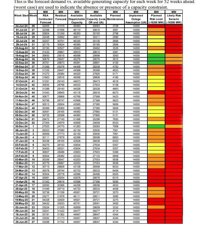 Die verslag se vooruitsigte vir 52 weke voorspel dat die vraag na elektrisiteit elke week van die jaar wat voorlê baie hoër sal wees as die beskikbare opwekkingskapasiteit.