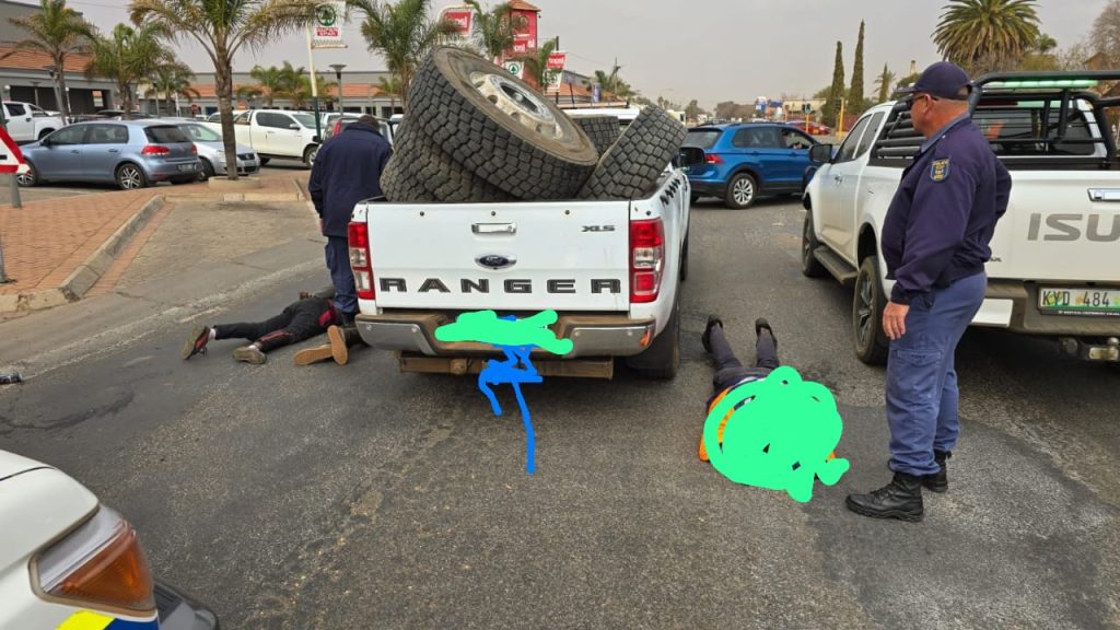 Volgens Mokgwabone is dieselfde voertuig Woensdag (31/7) opgemerk wat Lichtenburg binnery met vragmotorbande op. “Die voertuig is gestop en een passasier het probeer weghardloop, maar hy en twee ander verdagtes, onderskeidelik 32, 37 en 38 jaar oud, is vasgetrek.