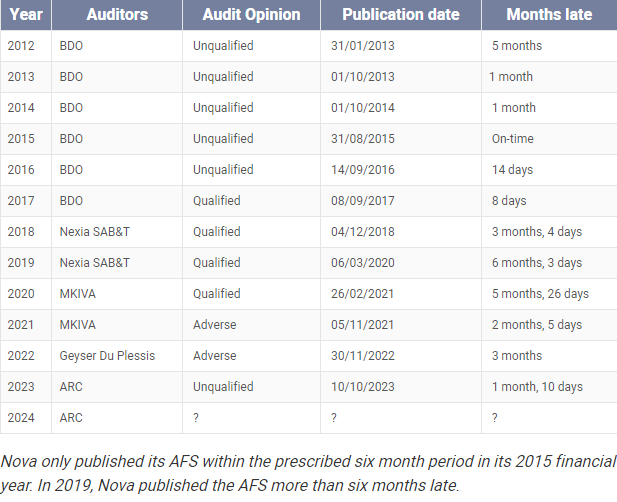 Toe Nova egter versuim het om sy AFS binne die tydraamwerk verlede jaar te publiseer, het Connie Myburgh, Nova se voorsitter en sy ouditeur, ARC Ingelyf, beweer die maatskappy het nie die wet oortree nie. Hulle het die wet geïnterpreteer as wat dit voorskryf dat die maatskappy die AFS moet voorberei en dit voor die einde van die ses maande tydperk aan die ouditeure moet voorlê en dat die ouditproses buite hierdie tydperk voltooi kan word.