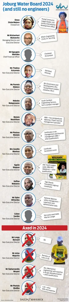Nie een van die Johannesburgse Waterraad-lede is ‘n professionele ingenieur nie. Elkeen van die regerende koalisievennote van die raad het blykbaar kaders ontplooi: onder die lede is ‘n sekretaris en moontlik ‘n musikant, Collen Sambo. Die voorsiener benodig profiele van sy raadslede aangesien dit so vinnig verander. Baie van die raadslede het wel grade, maar geen in velde wat relevant is vir water nie, veral vir ‘n waterstelsel wat besig is om in duie te stort nie. Die aanstellings verskaf werksgeleenthede of direkte kontrakte aan polities verbonde maatskappye, sê spesialiste.