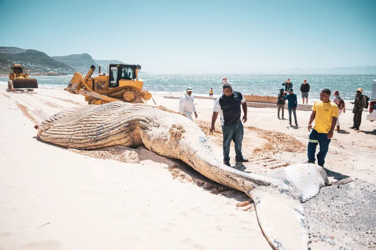 Dit is walvisseisoen in Suid-Afrika, ‘n tyd wanneer plaaslike inwoners en toeriste hulle gewoonlik verwonder om hierdie fassinerende wesens te sien wat vrolik in ons baaie inbreek of rustig onder die oppervlak van die see dryf. Dinsdagoggend het egter ‘n hartverskeurende toneel gebring – die gesig van ‘n dooie boggelrugwalvis wat langs Long Beach in Simonstad gestrand het.
