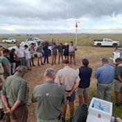 Saam deur die droogte: As boere in ’n kring in die droë veld staan