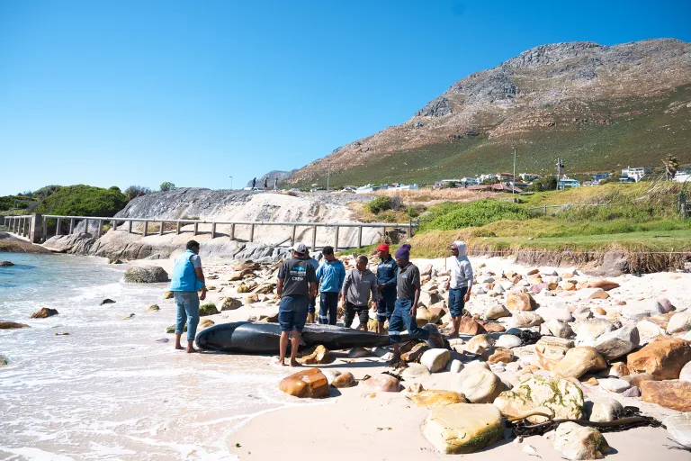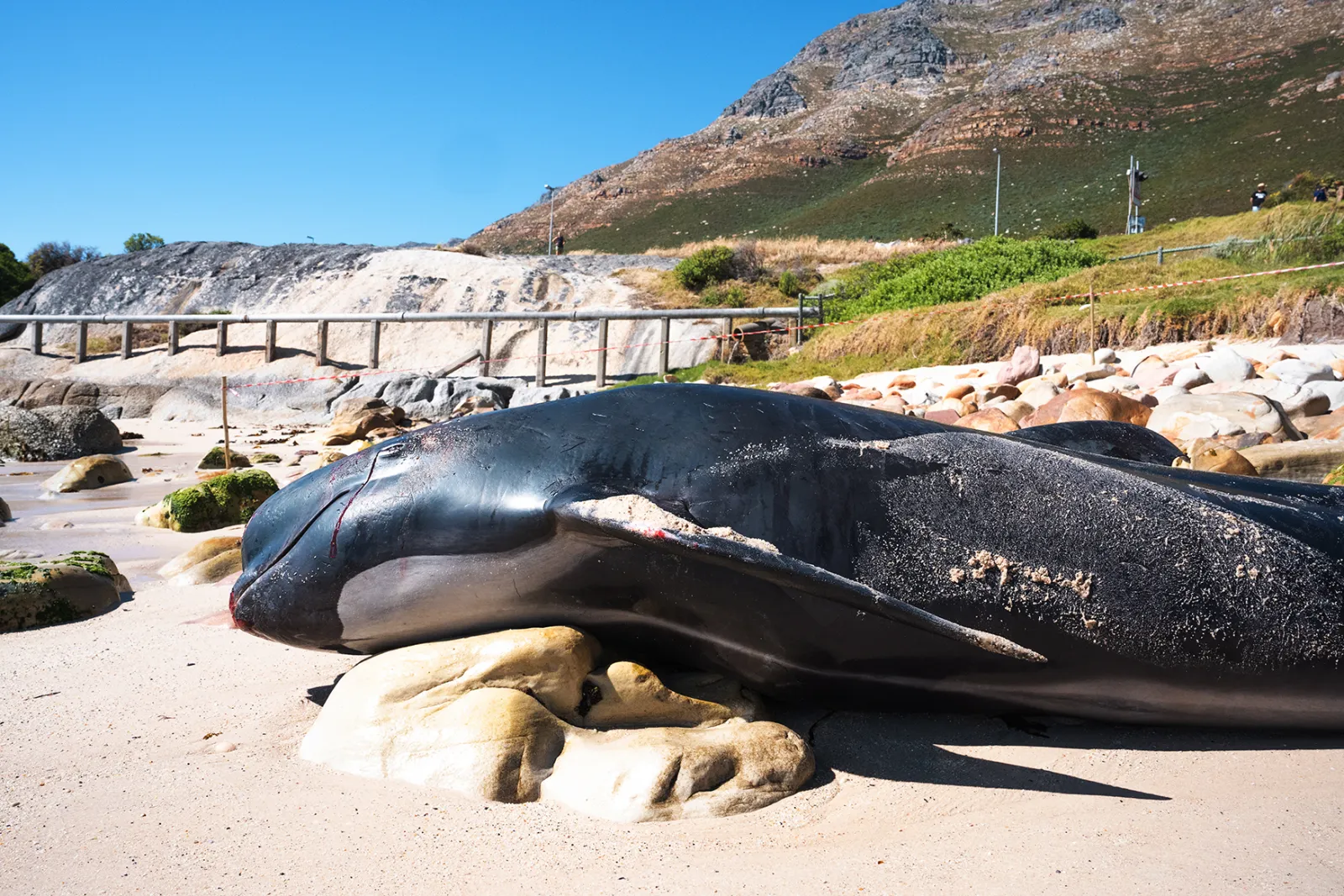 ’n Vroulike loodwalvis, wat 4,2 meter lank strek, is teen dagbreek, op 19 Desember 2024, op Frank’s Beach in Simonstad se Murdoch-vallei gevind.
