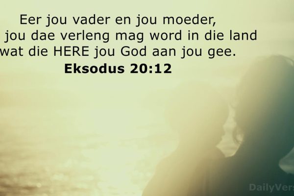 Teksvers: Eksodus 20:12 Eer jou vader en jou moeder, dat jou dae verleng mag word in die land wat die HERE jou God aan jou gee. In die 10 gebooie word daar pertinent melding gemaak hoe jy teen jou ouers moet optree. Aan die voorwaarde is ’n belofte gekoppel. Dit is duidelik dat die Here…